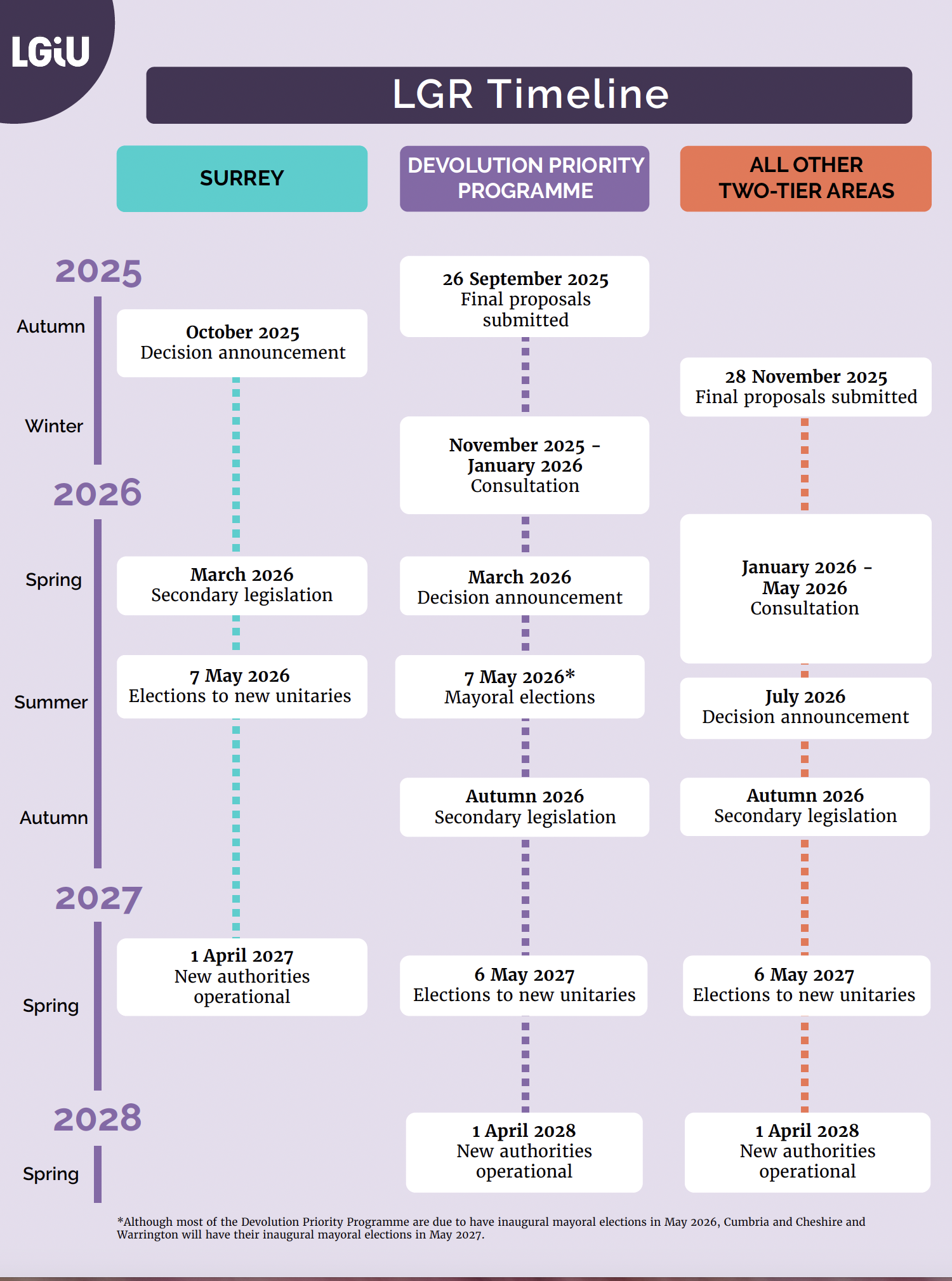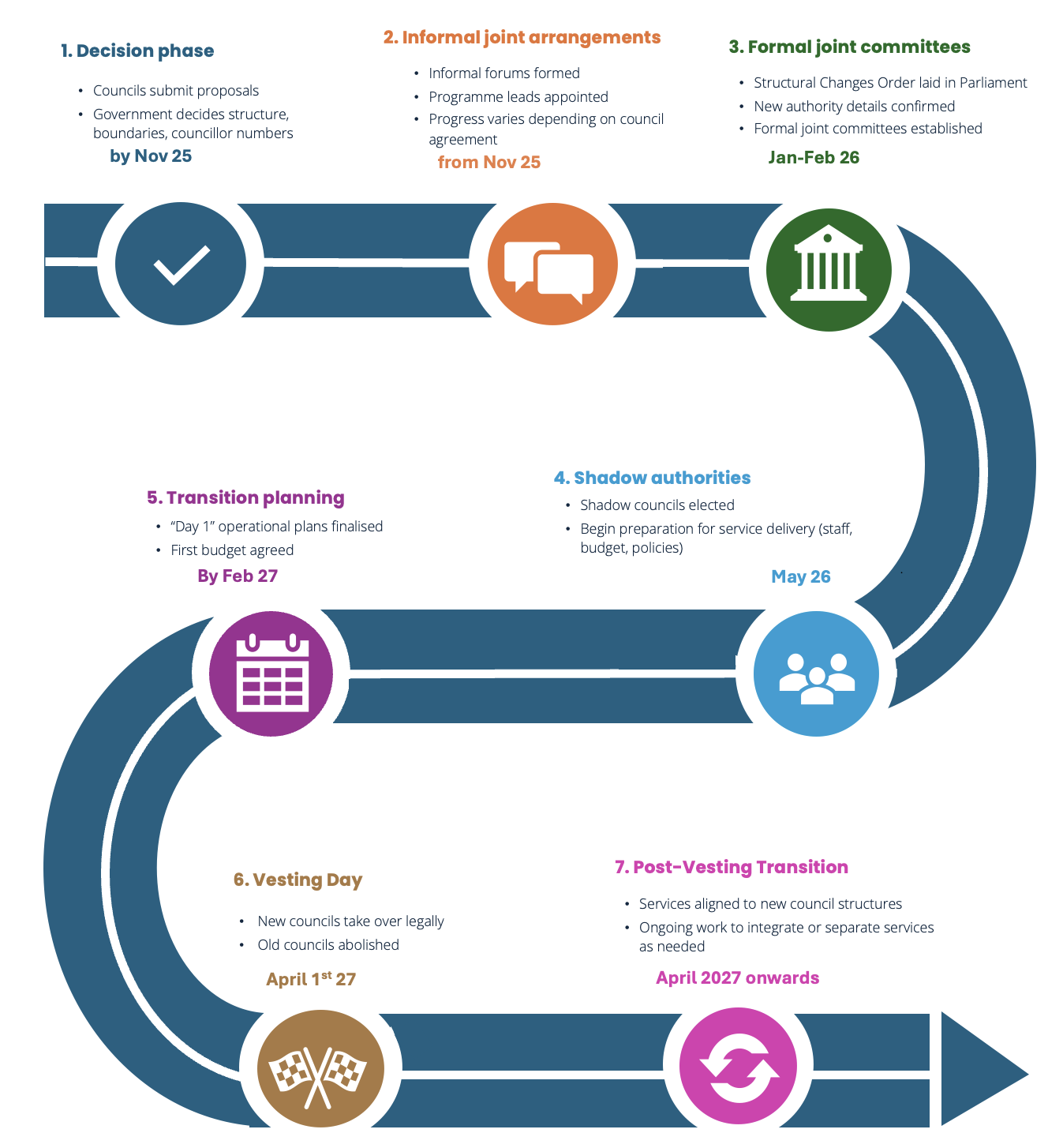 - Government decision to implement a proposal. Decisions will be made based on the criteria that Government has set, having regard to representations and responses to its statutory consultation. In the current cycle of LGR, this part of the process will have concluded, and Government will have taken a decision, by the end of 2025 or start of 2026 (in Surrey, on an “accelerated” pathway, this will happen sooner);